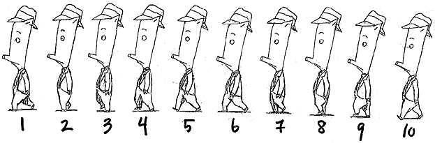 After learning how to create characters from basic shapes, determining their height and body details, creating turnarounds and still shots of their movements and finally practicing enough to keep the figures "on model", it is time to begin animating! Animation usually uses 30 frames per second, and there are infinite numbers of ways to move your characters within this time-frame. A basic movement is a "walk-cycle", as you can see above with Cornfed. This walk-cycle is 10 frames long, and can be repeated as many times as necessary to give the illusion of continuous movement.